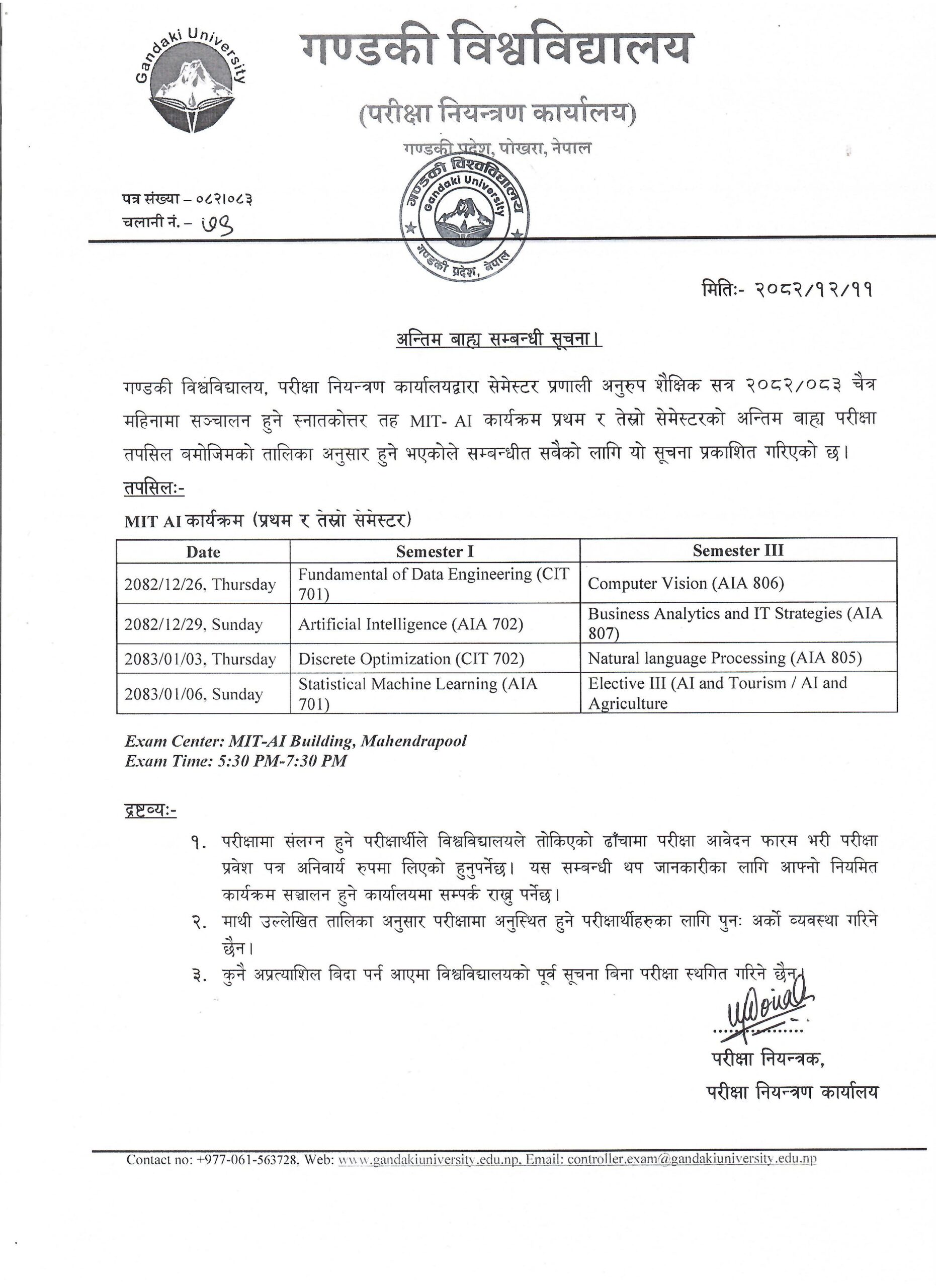Final Examination Schedule (MIT-AI) I & II Semester
